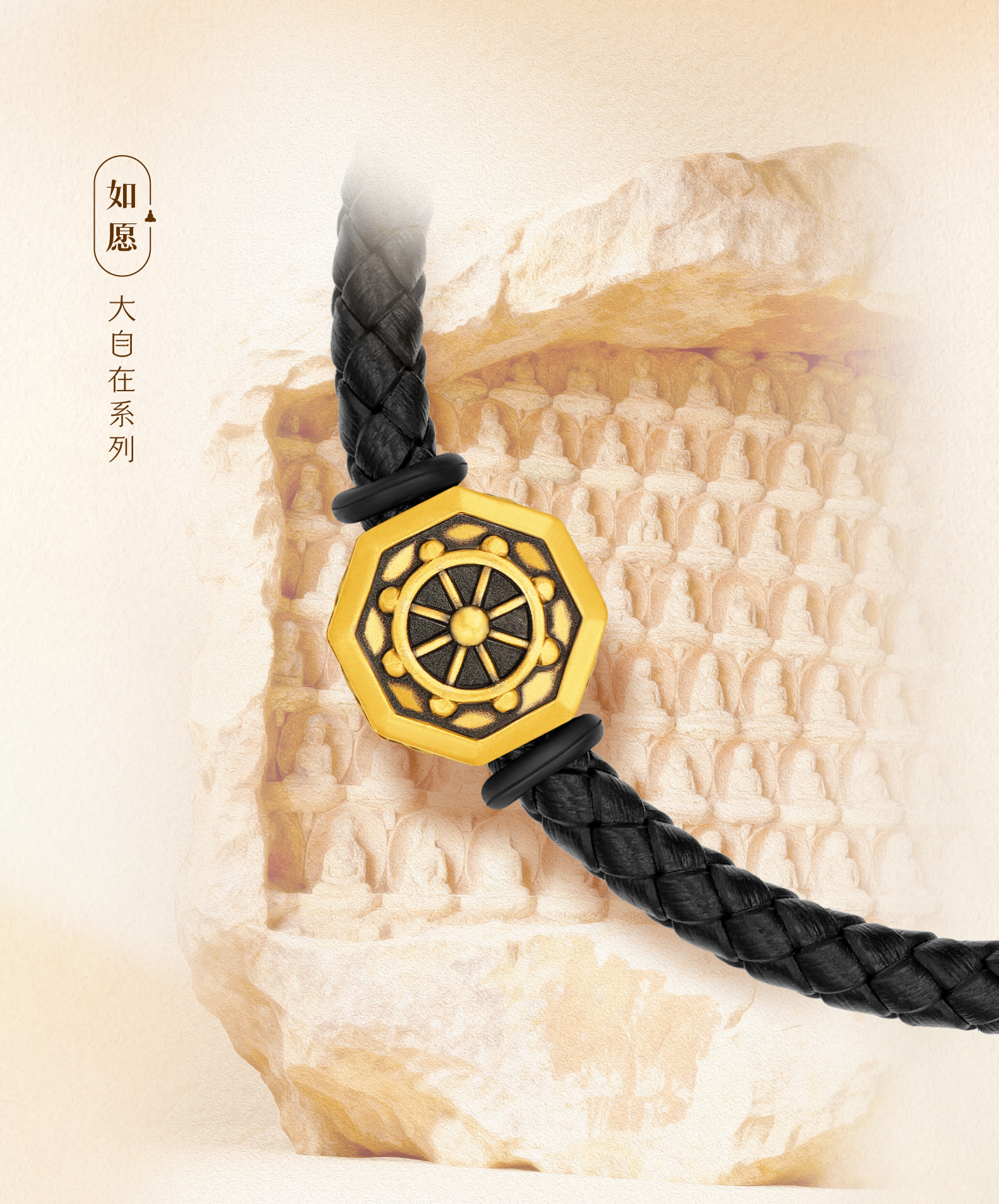 以转动法轮为核心元素,融合连绵钱纹,打造寓意“福慧双增”的禅意金饰,伴您顺遂安然。