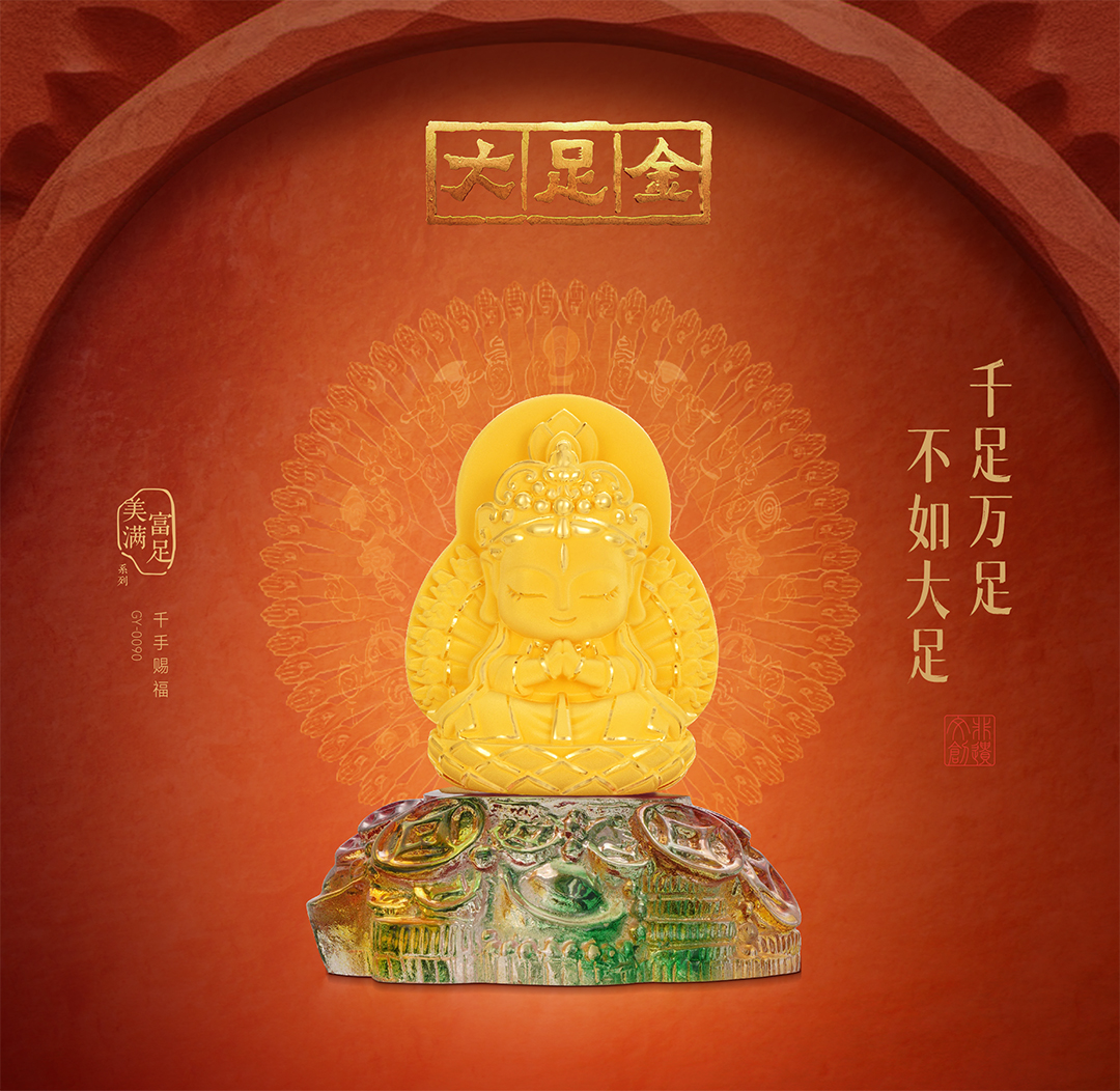 大足金系列产品,巧妙融合了大足石刻的非物质文化遗产元素与现代时尚设计理念,以"美满富足心满意足、知足常乐"的美好信仰文化为核心,通过精湛的金饰制作工艺,打造出既富有传统韵味又兼具时尚魅力的金饰佳品。这些金饰不仅承载着大足石刻的深邃智慧与独特艺术风格,更传递了对美好生活的向往和追求,让佩戴者在享受美的同时,也能感受到大丰大足文化的温暖与力量。